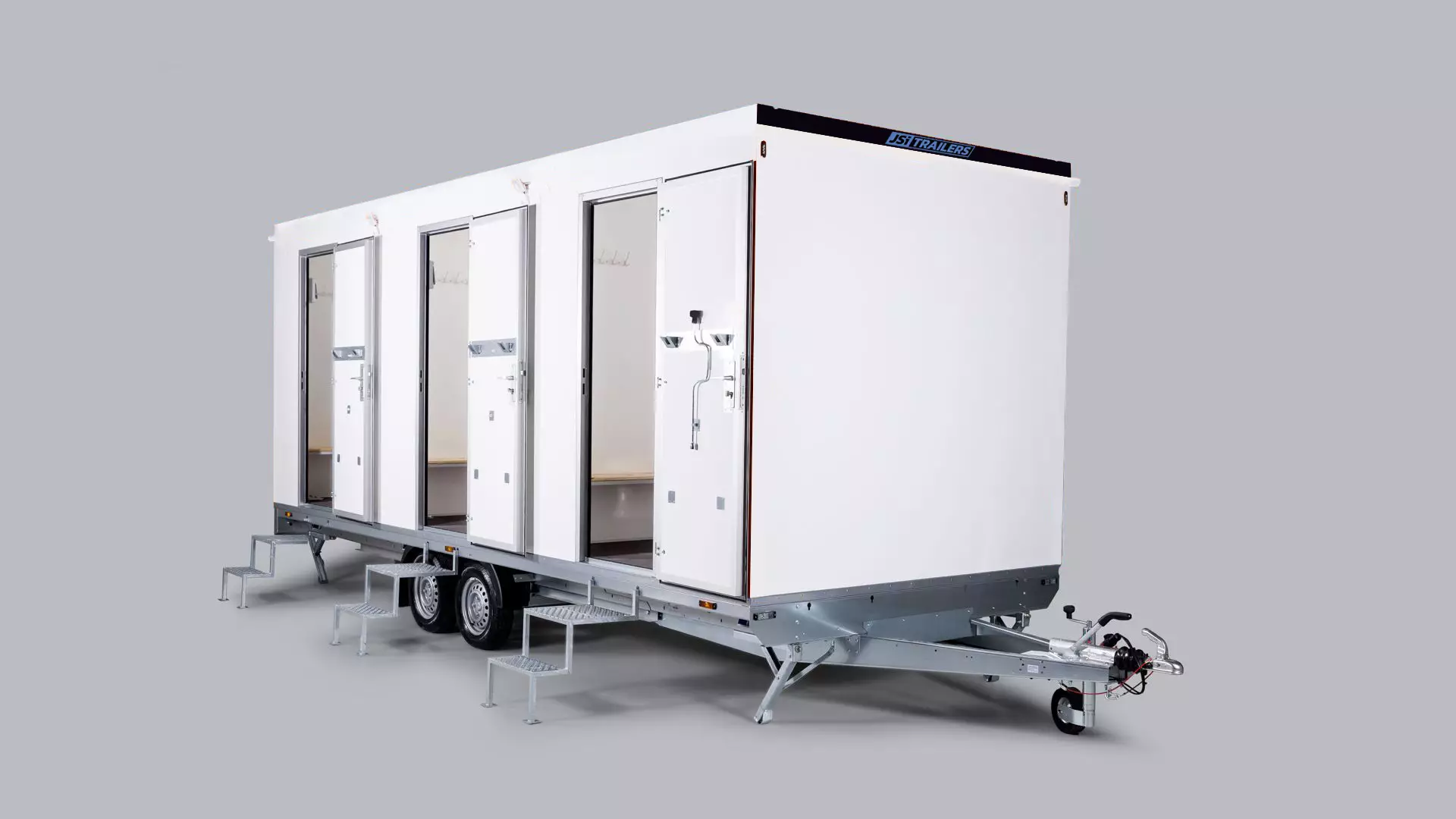 Jsi Trailers on suunnitellut siirrettävään kylpyhuoneeseen kaikki tarvittavat varusteet, jotta se olisi mahdollisimman mukava ja käytännöllinen. Vaunussa on kolme (3) identtistä kylpyhuonetilaa omilla sisäänkäynneillään. Liitä 230 V:n virtajohto sähköjärjestelmään, kytke letkut ja kaikki on valmista! Huoneissa on automaattinen ilmanvaihtojärjestelmä, kostean tilan lämpöpatteri, penkki, peili- ja vaatekoukut. Voimakkaat LED-valot sekä pistorasiat, jotka tarjoavat tehoa kaikkiin tarvittaviin laitteisiin.