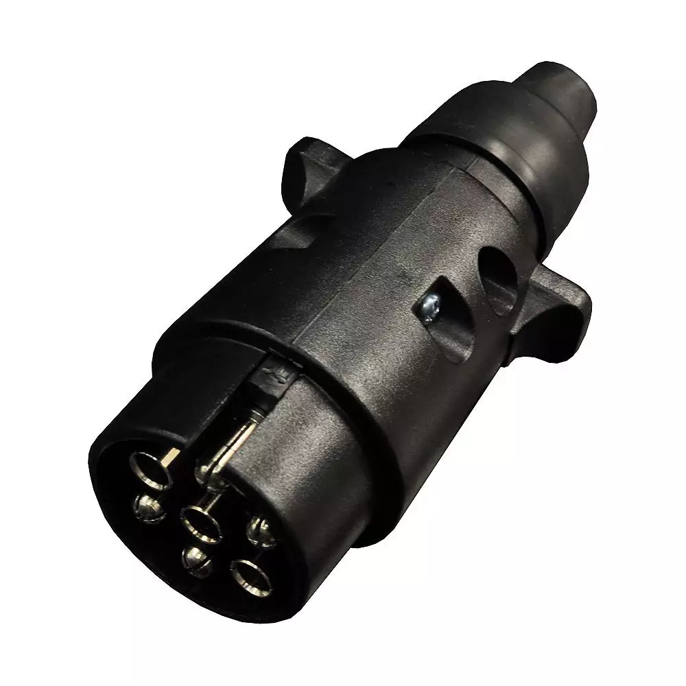 Perävaunun muovi pistoke, 7-napainen. Ruuvikiinnitteinen kuori ja ruuvikiinnitteiset johtoterminaalit.